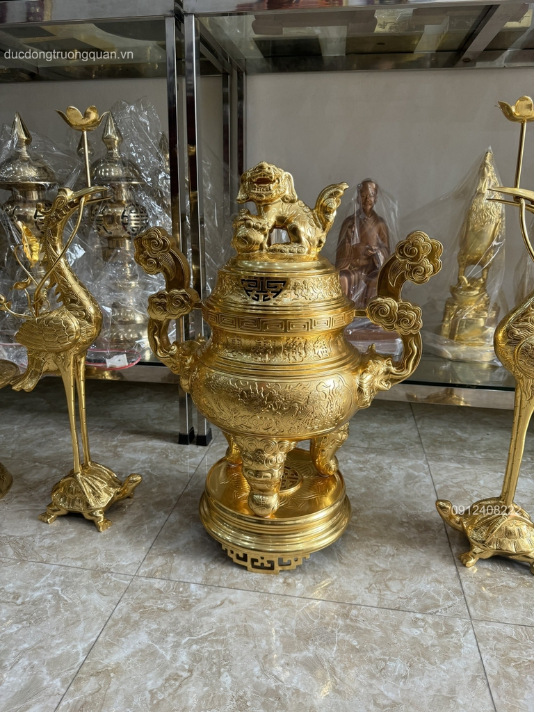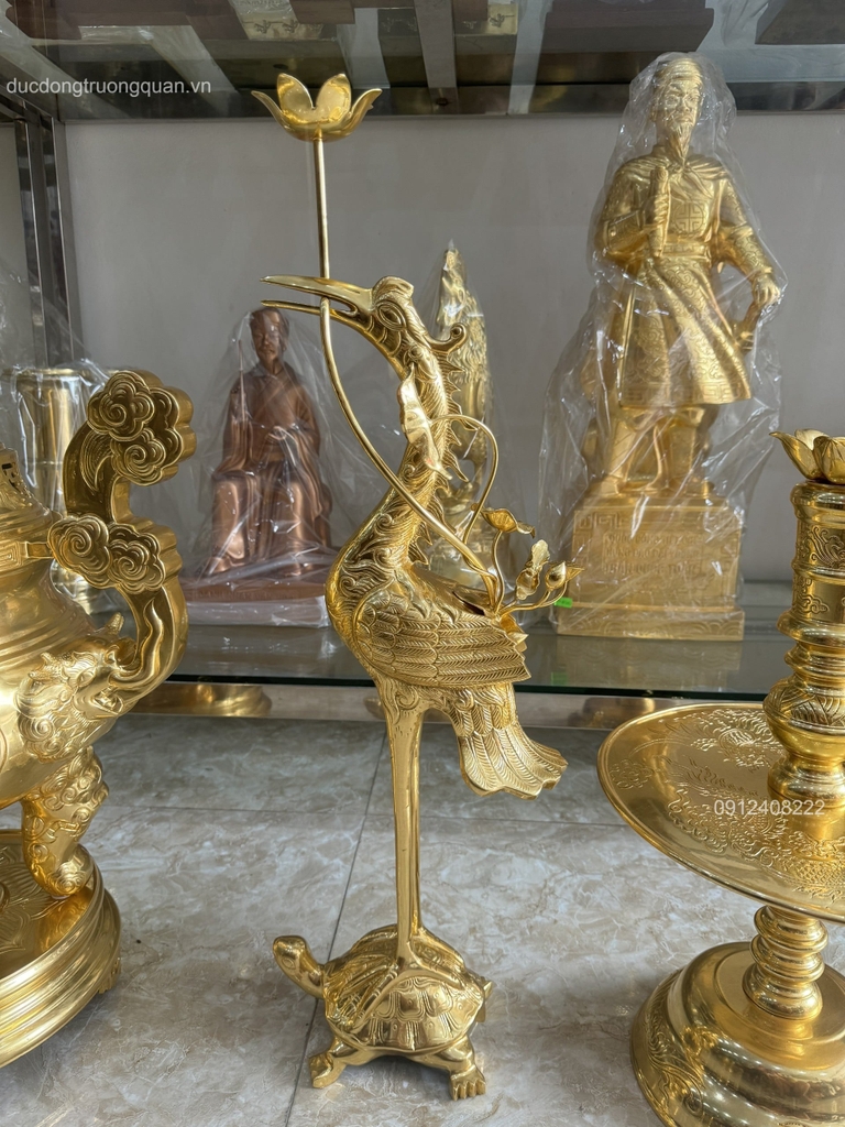 Bộ ngũ sự bằng đồng đẹp thông thường bao gồm: đỉnh đồng, đôi hạc đứng trên lưng rùa, đôi nến Đây là bộ đồ thờ cúng bằng đồng được nhiều gia chủ lựa chọn nhất. Bởi chúng không chỉ mang lại vẻ đẹp sang trọng, uy nghiêm cho không gian, mà còn sỡ hữu giá trị tâm linh phong thủy sâu sắc.