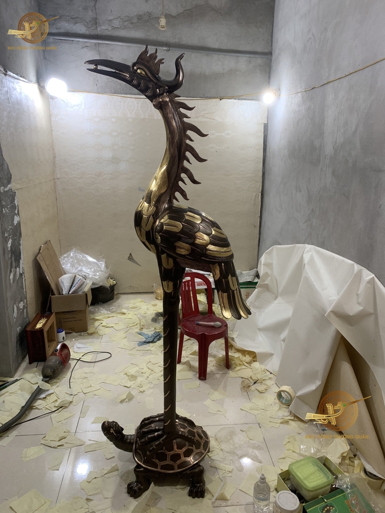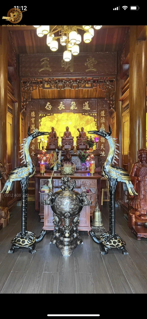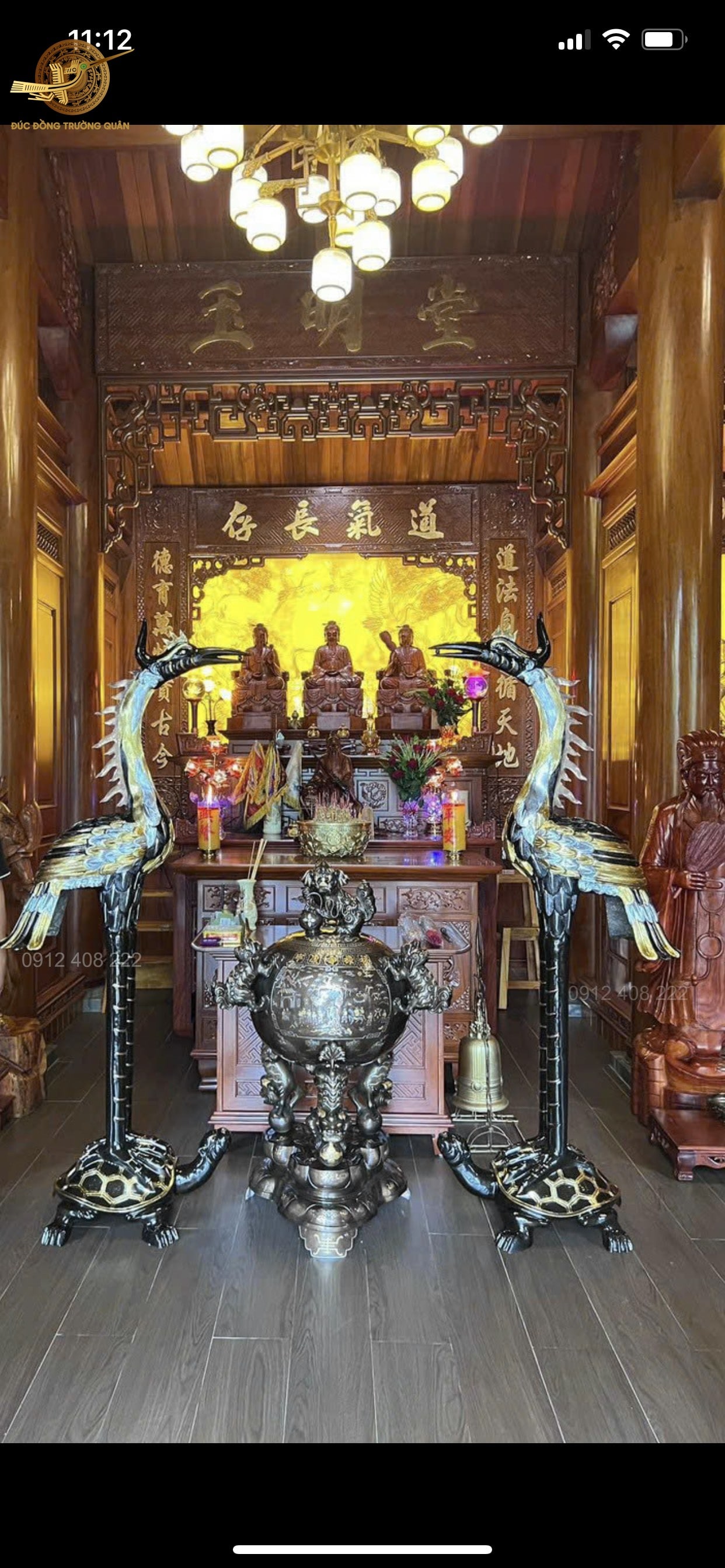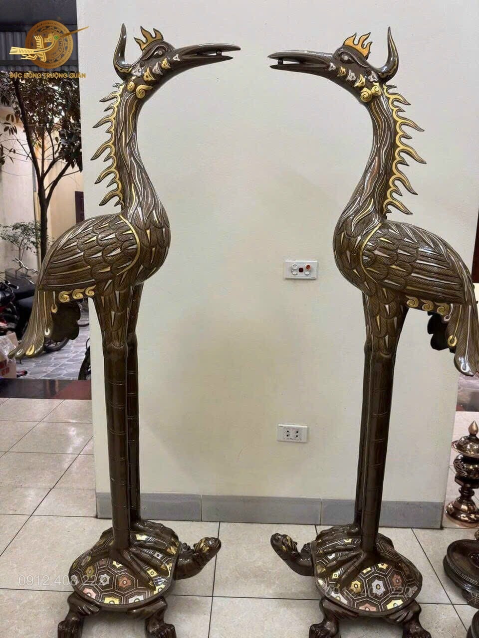 mẫu hạc bằng đồng 1m97 dát điểm vàng 24k được bài trí cùng đỉnh thất lân