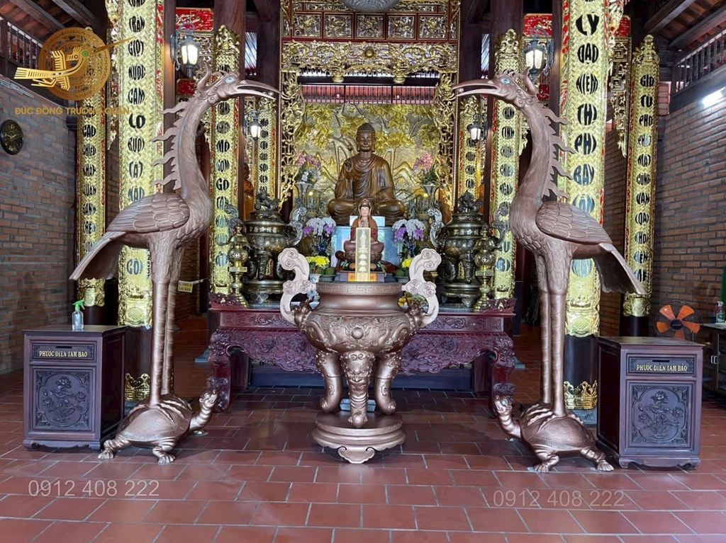 đôi hạc bằng đồng 1m97 được bài trí tại cung thờ phật thích ca