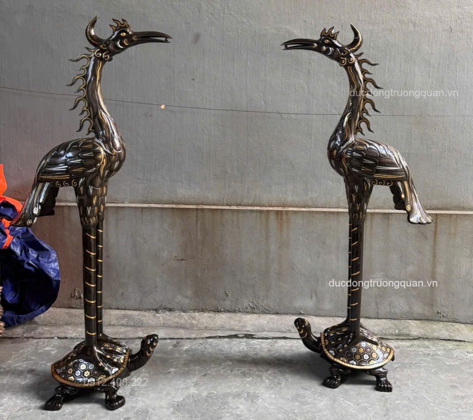 Đây là mẫu sản phẩm được thiết kế theo kiểu cách truyền thống với dáng đứng trên lưng rùa. Đầu ngẩng cao, thân mình được đúc dày dặn, chắc chắn. Các đường lông vũ được tỉa vô cùng tỉ mỉ, đẹp mắt mà không mang lại sự rối mắt. Đồng thời, các được nét khảm được phối hợp với nhau rất hợp lý, làm nổi bật rõ nét các chi tiết cũng như tạo ra được chiều sâu cho sản phẩm.