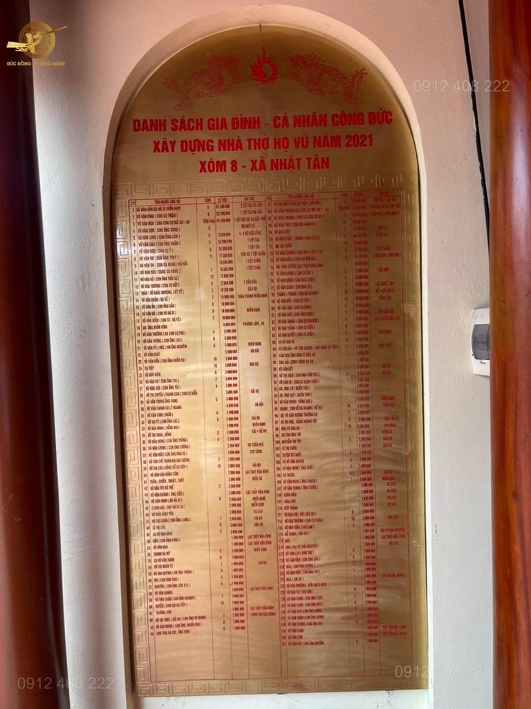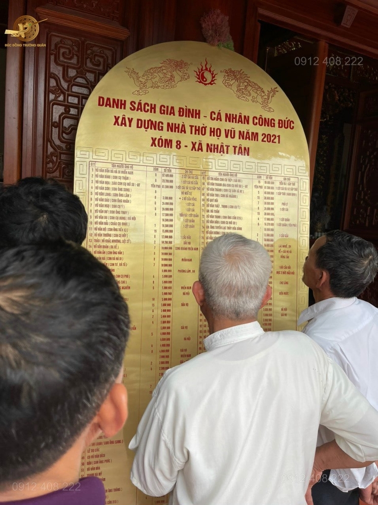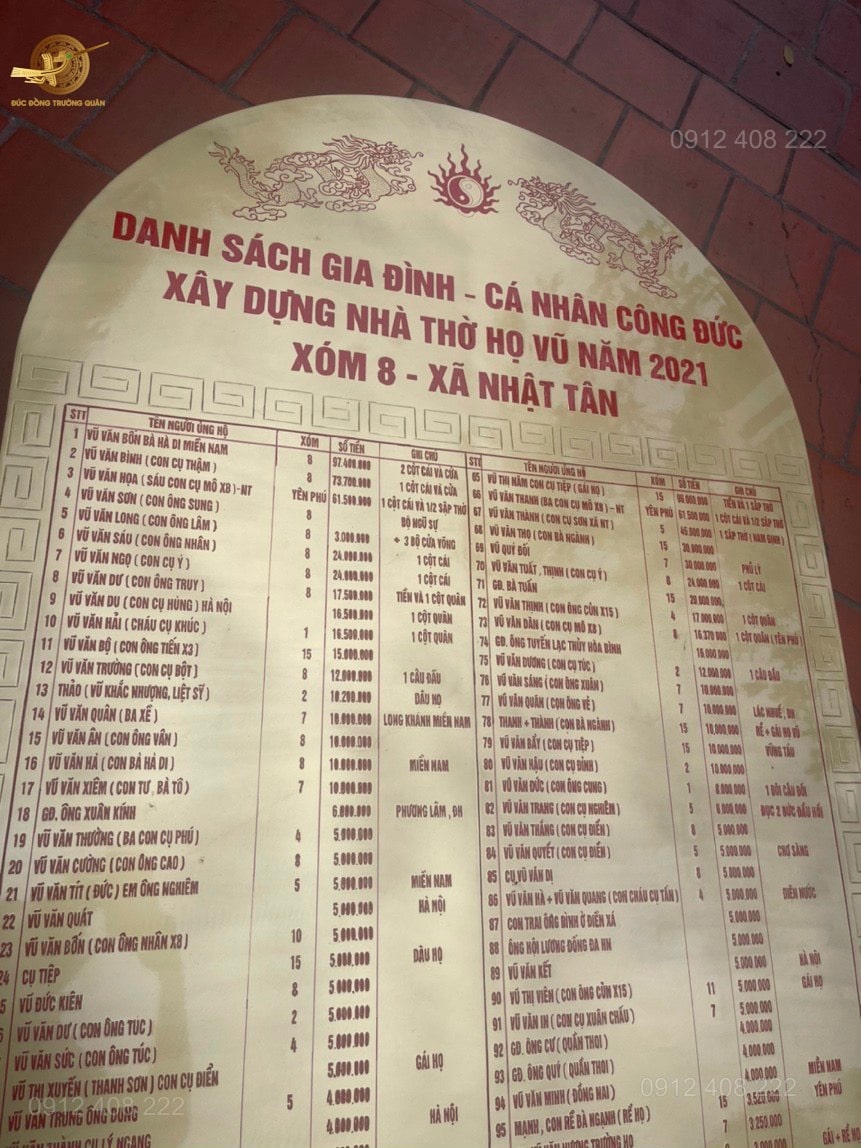 Việc xây dựng nhà thờ có ý nghĩa rất quan trọng trong đời sống tâm linh mỗi người, là cơ sở để gắn kết anh em, con cháu của dòng họ. Nhà thờ tổ họ sẽ là nơi lưu giữ cội nguồn của dòng họ, có tác dụng tạo nên lòng tự hào cho con cháu, nhắc nhở họ hướng về cội nguồn và sống sao cho xứng đáng với tổ tiên.Vì lẽ đó, Đúc Đồng Trường Quân hữu duyên được các Cụ trong dòng họ Vũ gửi gắm ý tưởng để làm nên một bảng tên ghi danh công đức thể hiện đầy đủ chi tiết,hoa văn sắc nét về các những người có công đóng góp trong dòng họ!