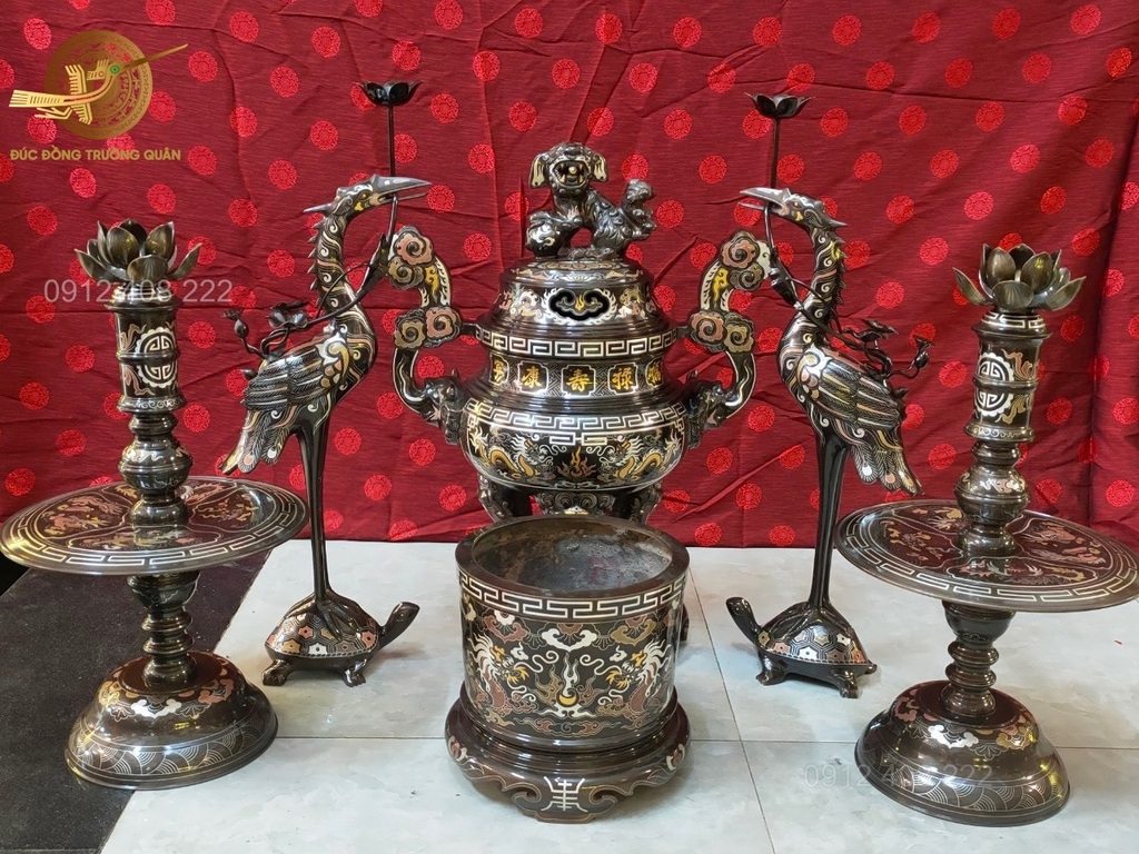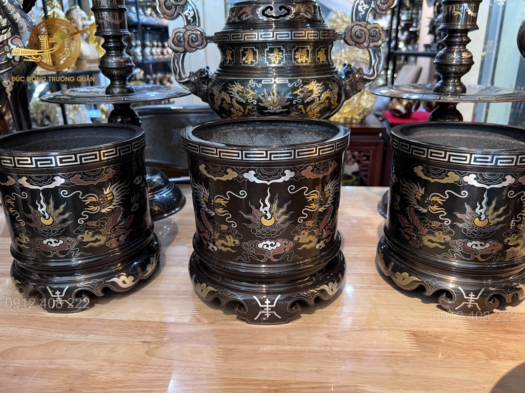bát hương đồng khảm ngũ sắc được bày cũng bộ đỉnh thờ ngũ sự cao cấp