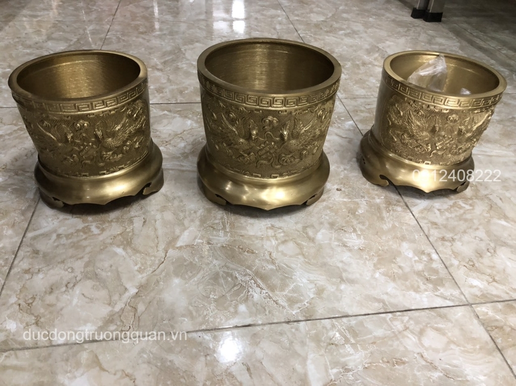 Bộ 3 bát hương bằng đồng catut đường kính 16cm - 18cm - 16cm thuộc dòng đồ thờ cao cấp, chất lượng, được hoàn thiện trực tiếp bởi các nghệ nhân Trường Quân. Sản phẩm có kích cỡ phổ biến, thích hợp bày trí trên nhiều không gian thờ cúng tâm linh.