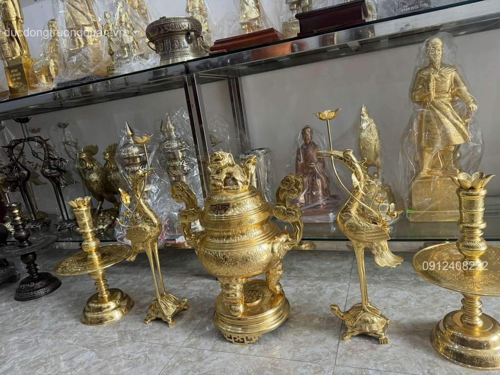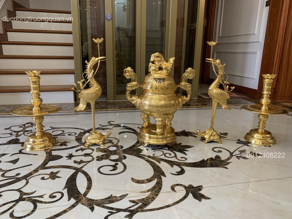 Bộ ngũ sự bằng đồng đẹp thông thường bao gồm: đỉnh đồng, đôi hạc đứng trên lưng rùa, đôi nến Đây là bộ đồ thờ cúng bằng đồng được nhiều gia chủ lựa chọn nhất. Bởi chúng không chỉ mang lại vẻ đẹp sang trọng, uy nghiêm cho không gian, mà còn sỡ hữu giá trị tâm linh phong thủy sâu sắc.
