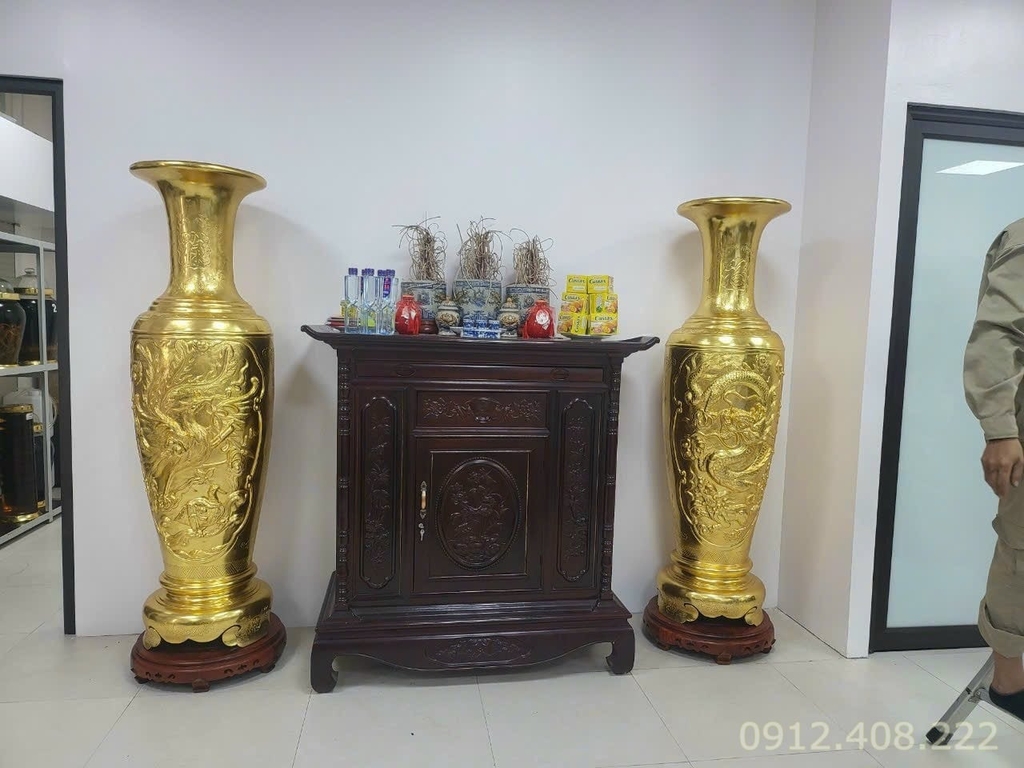 đôi lộc bình đúc cảnh long phụng nổi dát vàng 24k