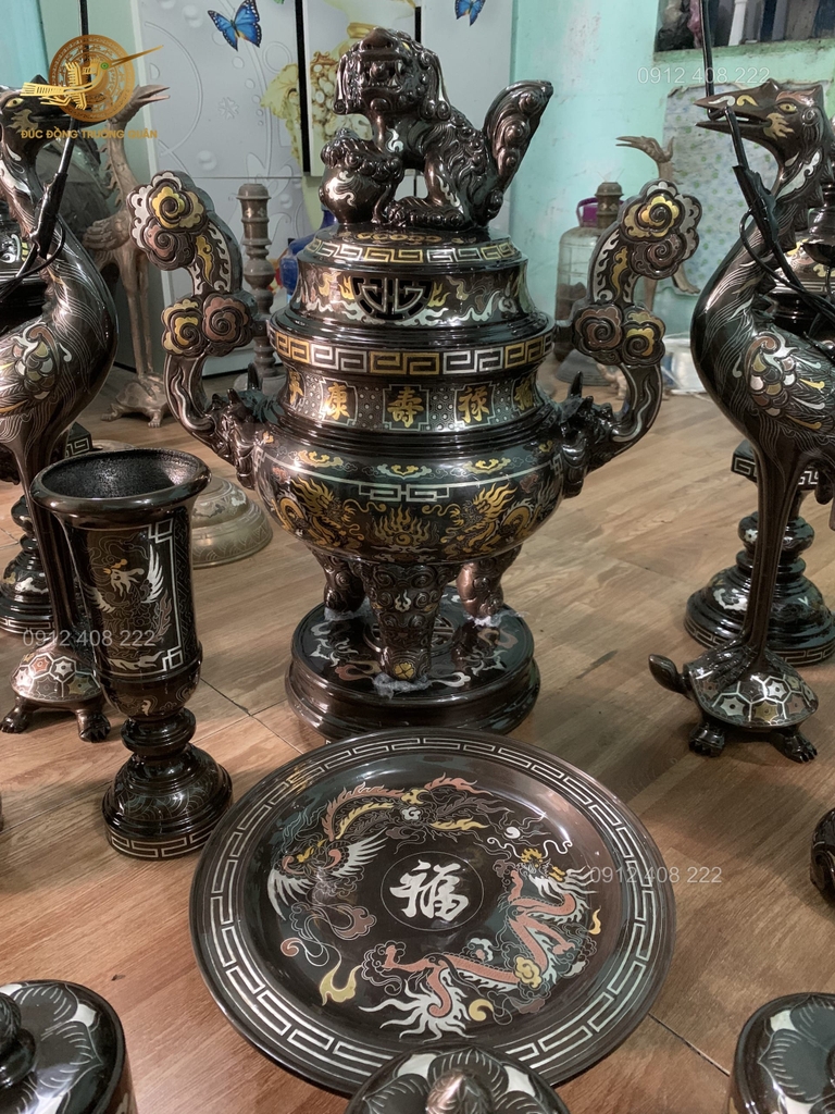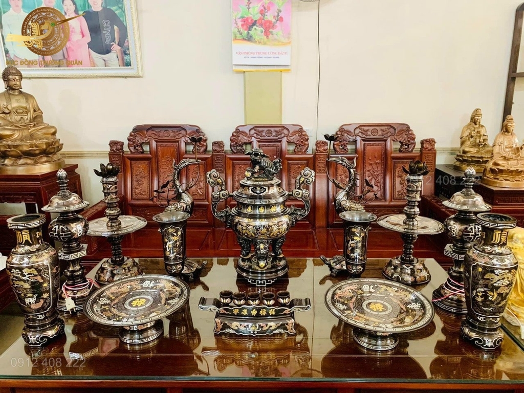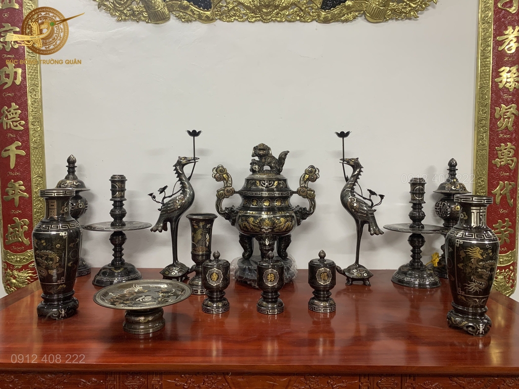 Sản xuất: sản phẩm đồ thờ khảm ngũ sắc được đúc thủ công trực tiếp tại xưởng đúc đồ thờ cúng Trường Quân – Ý Yên – Nam Định.