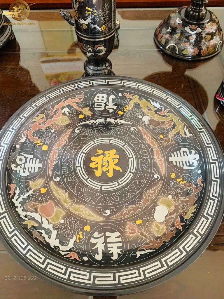 mâm bồng khảm ngũ sắc với chữ Phúc khảm bạc ở giữa trung tâm