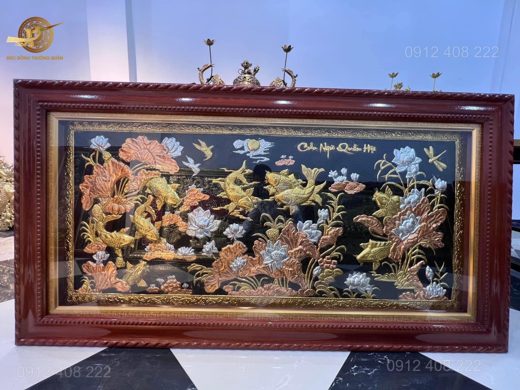 Đây là 1 bức tranh đồng phong thủy rất hay về ý nghĩa, đẹp về bố cục. Bức Tranh Cửu ngư hoa sen mang vẻ đẹp thanh khiết với hình ảnh chín chú cá lớp vẩy vàng óng, vẻ đẹp tinh khôi, ngát hương của hoa sen thơm ngát.