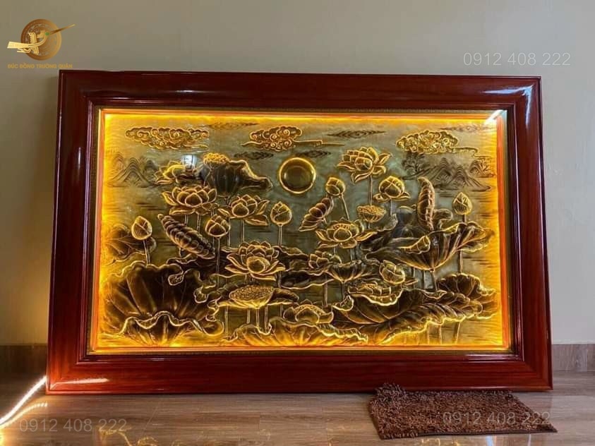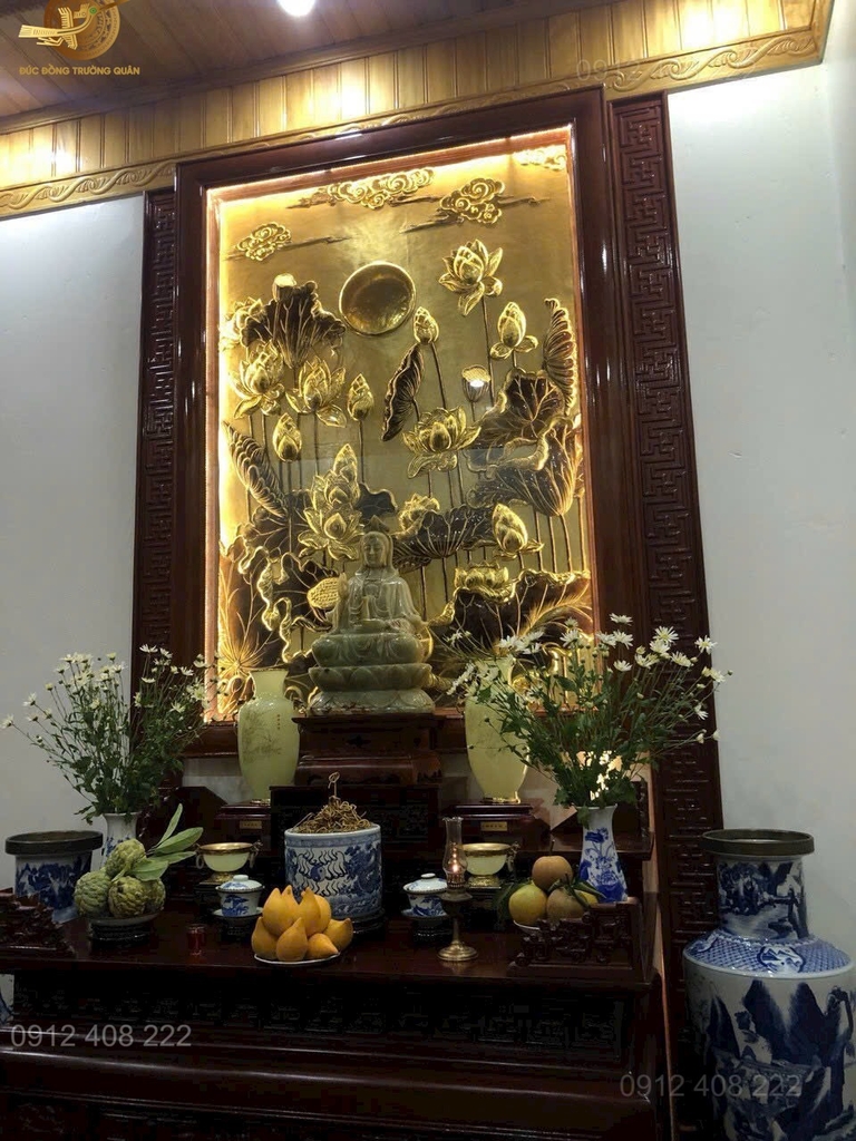 Tranh sen bằng đồng được treo đẹp trên ban thờ