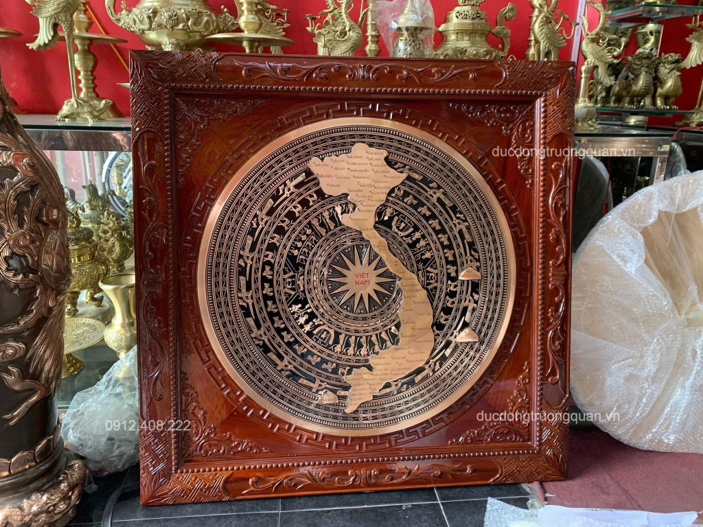- Bức tranh mặt trống đồng hình bản đồ Việt Nam là dòng sản phẩm cao cấp tại Hoàng Gia được nhiều người lựa chọn để bày trí cho không giản sống thêm sang trọng và ý nghĩa. Bức tranh được nghệ nhân của Đúc Đồng Trường Quân chế tác hoàn toàn theo phương pháp đúc thủ công truyền thống với đường nét vô cùng tinh xảo và đẹp mắt mang đến bức tranh với giá trị thẩm mỹ cao. Tranh được làm dựa trên mẫu trống đồng cổ kết hợp với họa tiết bản đồ Việt Nam càng giúp tăng thêm tính thẩm mỹ cũng như ý nghĩa cao nhất.