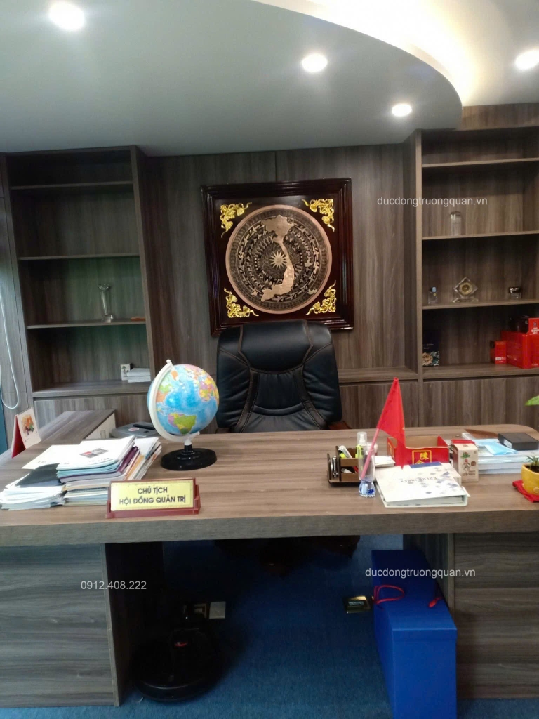 Chúng ta đều biết rằng trống đồng được coi là bảo vật quốc gia được gìn giữ qua nhiều thế hệ. Trống đồng không chỉ mang ý nghĩa tinh thần lưu giữ những nét văn hóa truyền thống độc đáo của người Việt cổ mà còn mang ý nghĩa phong thủy tốt lành cho gia chủ trên con đường công danh, tài lộc. Do đó mặt trống đồng hình bản đồ Việt Nam thích hợp bày trí tại không gian phòng khách, phòng làm việc để tăng thêm sự sang trọng cũng như mang lại phong thủy tốt nhất cho gia chủ trên con đường công danh, tài lộc.