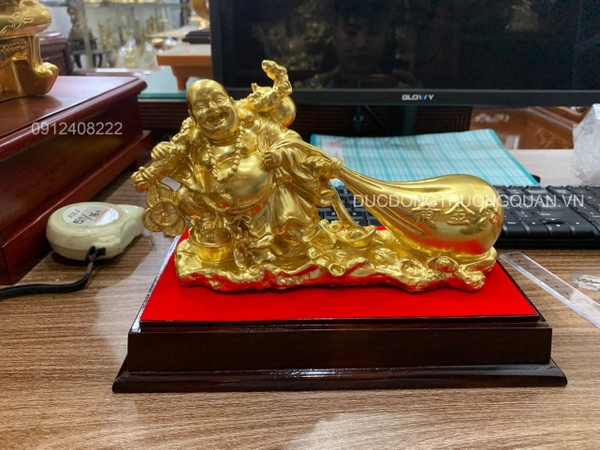 Tượng Phật Di Lặc kéo bao tiền bằng đồng dát vàng 24k có hình dáng ngài đang kéo bao tiền và trên vai gánh xâu tiền, lọ hồ lô. Trên khuôn mặt ngài luôn được thể hiện với nụ cười thật hiền hậu tạo cho chúng ta cảm giác được bình an và hạnh phúc.Tượng Phật Di Lặc kéo bao tiền có hình dáng ngài đang kéo bao tiền và trên vai gánh xâu tiền, lọ hồ lô. Trên khuôn mặt ngài luôn được thể hiện với nụ cười thật hiền hậu tạo cho chúng ta cảm giác được bình an và hạnh phúc. Tượng rất phù hợp để bày bàn làm việc, bày bàn trà, bàn tiếp khách sang trọng, hoặc làm quà biếu tặng rất ý nghĩa.