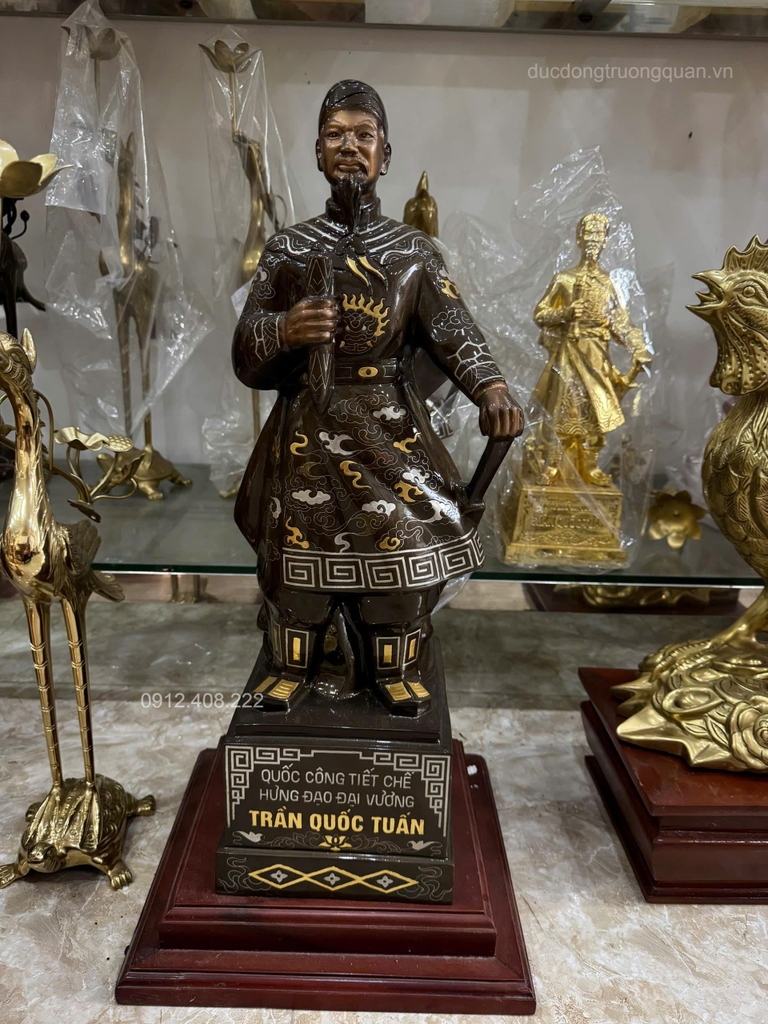 Tượng Trần Quốc Tuấn bằng đồng cũng dễ dàng cho các nghệ nhân sử lí các chi tiết, đường nét tinh vi hơn, chuẩn chỉnh nhất. Phần đế tượng có dáng bệ vuông, bên trên có đề tên và danh hào của anh hùng Trần Quốc Tuấn và các đường hoa văn triện.